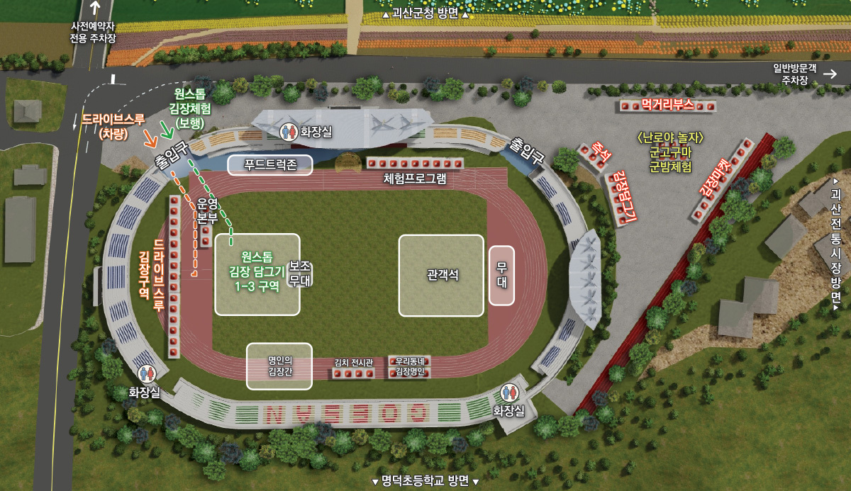 일행별 단독부스 운영 가족, 연인, 친구와 즐거운 추억담그기 2023.11.03(금) ~ 11.05(일) 3일간 괴산종합운동장 '드라이브-스루 김장담그기'구역 |