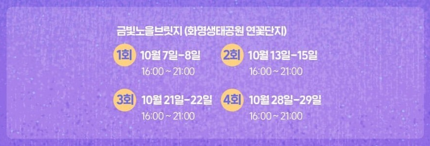 2023년 10월에 북구 화명생태공원 연꽃단지 금빛노을브릿지에서 열리는 야시장은 누구나 참가 가능합니다.
