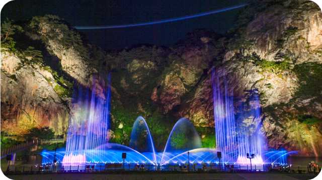 소금산 절벽을 배경으로 펼쳐지는 멋진 음악과 역동적인 분수쇼. 세계 3대 분수에 적용된 최첨단 분수기술을 활용한 명품분수로 하천에 설치된 국내 최대 규모의 음악분수입니다.