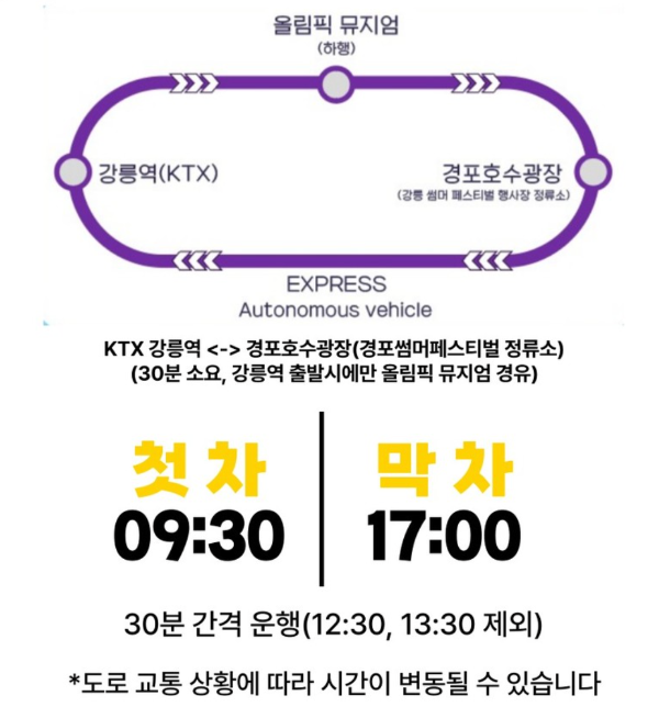 2023 경포썸머 페스티벌에서 축제기간 동안 자율주행 셔틀을 무료로 운영하고 있습니다! 매일 아침 9시 30분부터 오후 5시까지 30분 간격으로 KTX 강릉역과 경포썸머페스티벌 정류소(경포호수광장)을 오가는 자율주행 셔틀을 이용해 보세요!