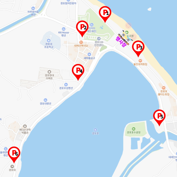 - P5(경포호수광장) 240대 주차 가능, 도보 10분 거리 강원 강릉시 강문동 263