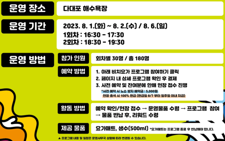 원더풀 컬러풀 원더풀 콘서트 : 청량한 바다에서 듣는 여름 감성 콘서트 컬러풀 불꽃쇼 : 눈부신 노을 아래 펼쳐지는 감동의 불꽃쇼 |